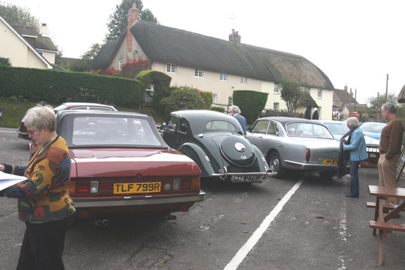 ![At the Wise Man, W. Stafford, nr Dorchester - a gathering of 6 owners w/cars [l to r, David Bensley, 412S1; John and Mary Stokes, '48 400; Bob Standbridge, 411S3; Stewart White, 406, not in photo; a former 603 owner, Simon Collison; and an owner/wife, Ric & Ann Bull, who came w/o their 400.]